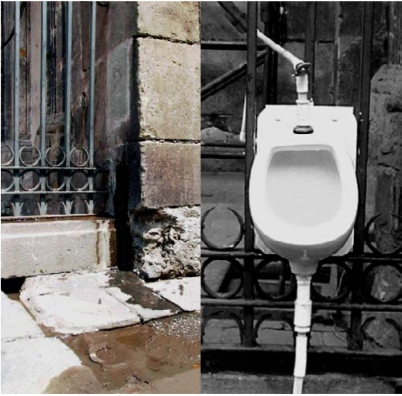 A corner in a street where people regularly urinated was selected as the site for installing a functional urinal. This piece references Fountain (1917) by Rrose Sélavy (Marcel Duchamp), recognizing the function of the corner and “returning” Duchamp’s piece to its original purpose before it became an art object, while also giving it a literal meaning by making the urinal a water fountain.